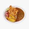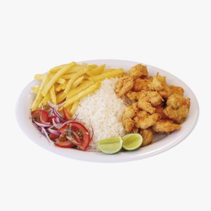 Camarones a la plancha acompañados de arroz blanco, menestra, maduros fritos y curtido