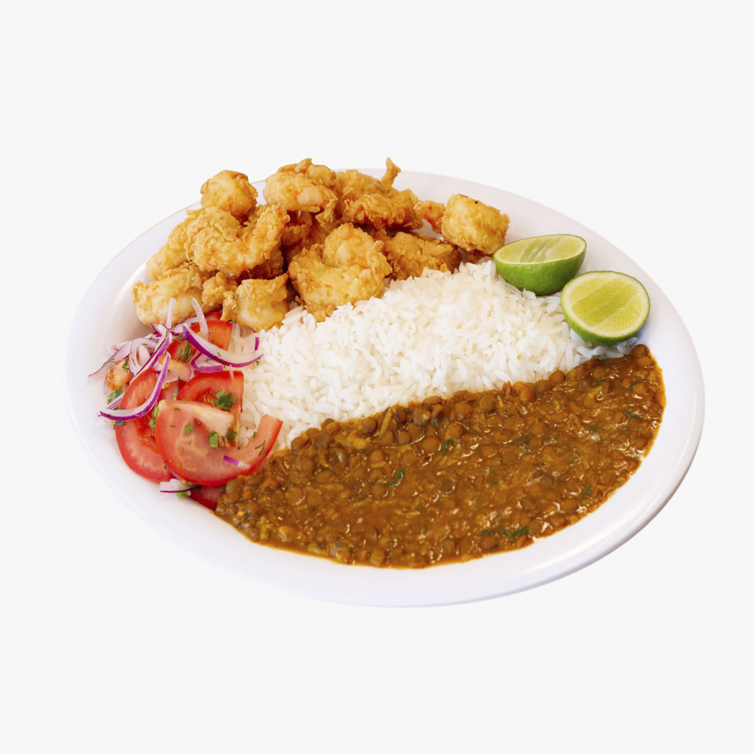 Camarones apanados acompañados de menestra, arroz blanco, maduros fritos y curtido.