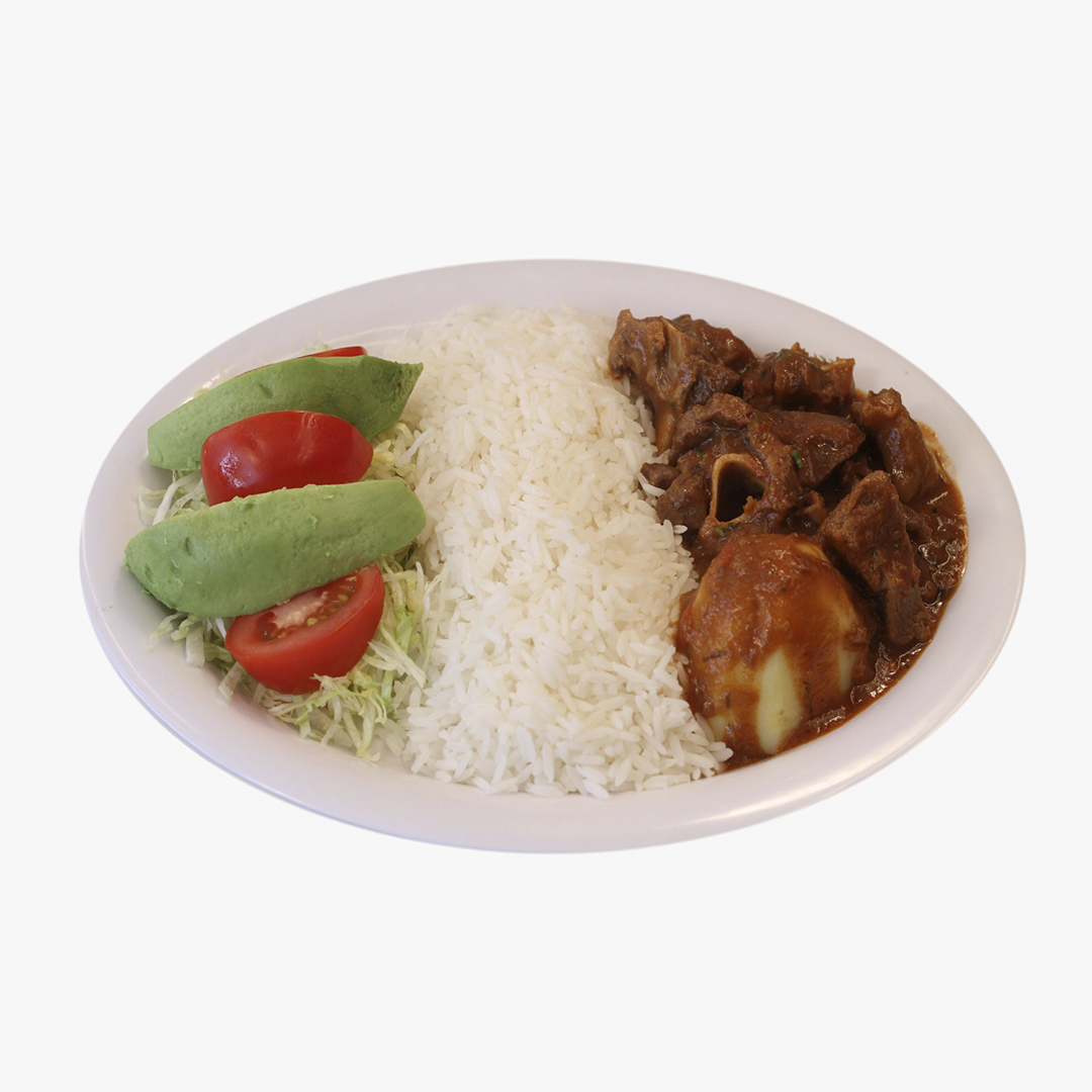Seco de chivo acompañado de arroz blanco, papa al vapor y ensalada.